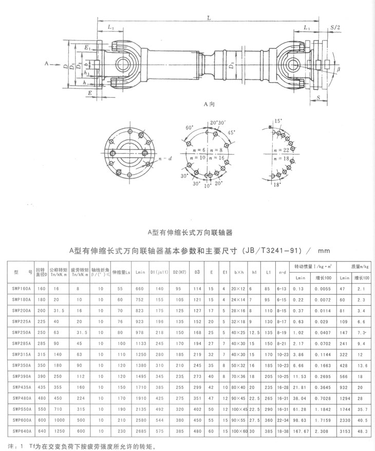A型有伸縮長型萬向聯(lián)軸器基本參數(shù)和主要尺寸