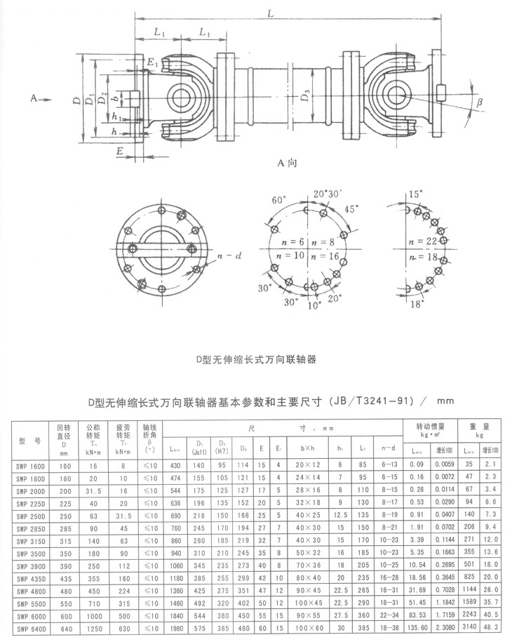 D型無伸縮長型萬向聯(lián)軸器基本參數(shù)和主要尺寸